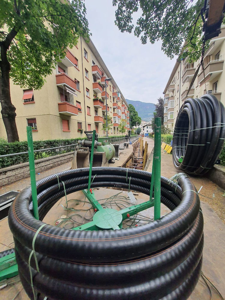 Per prime sono state posate le tubazioni di maggior diametro: dal 160/225 al 125/202 con tempi di posa davvero notevoli. Infatti posare due rotoli da 75/80m richiede una mezza giornata di lavoro contro i 4/5 giorni necessari per gli scavi. #FibreFlex garantisce quindi lunghe tratte continue di tubazione preisolata, posate velocemente senza alcun punto critico rappresentato da giunzioni o muffolature.